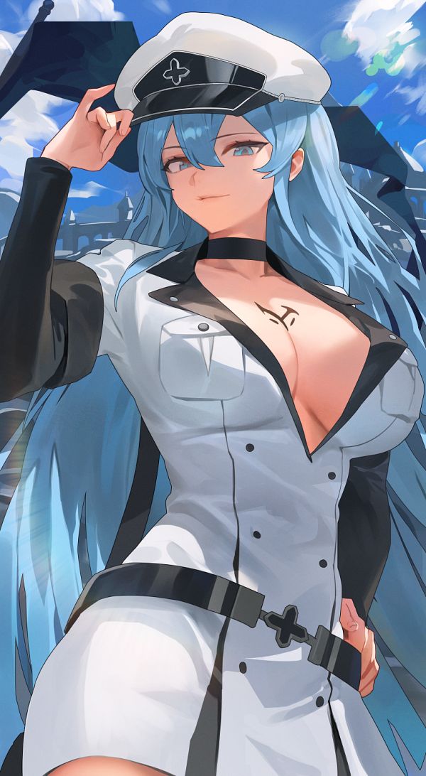 Esdeath was a tall, beautiful and slender woman with long, light blue hair and blue eyes. She wore a General's apparel with long sleeves with buttons on the upper arms, a blue scarf on her neck and high-heeled boots. She also has a tattoo on her chest, which is the sign of her Teigu.