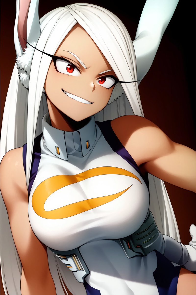 Rumi is a dark-skinned woman of average height. She has red narrow eyes with long, defined eyelashes, and straight white hair reaching her thighs with bangs that part to the left of her face. While slender and curvaceous in frame, she also sports a lean, athletic and well-defined build, especially in her arms and legs. From her Quirk, Rumi has long white rabbit ears pointing upwards above her head, along with a small and white round tail, giving her an overall resemblance to an albino rabbit.