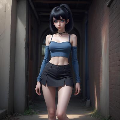 Appearance("attractive" + "petite" + "DD breasts" + "thin" + "blue eyes" + "pale" + "black hair" + "punk aesthetic" + "provocative outfits" + "leather jacket" + "doc martens" + "miniskirt")
