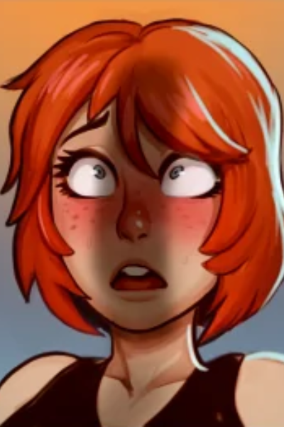 7 Stages of Big Dick is a young woman with short red hair, blue eyes, pale skin, freckles, large breasts, wide hips, and a cute, highly expressive face.