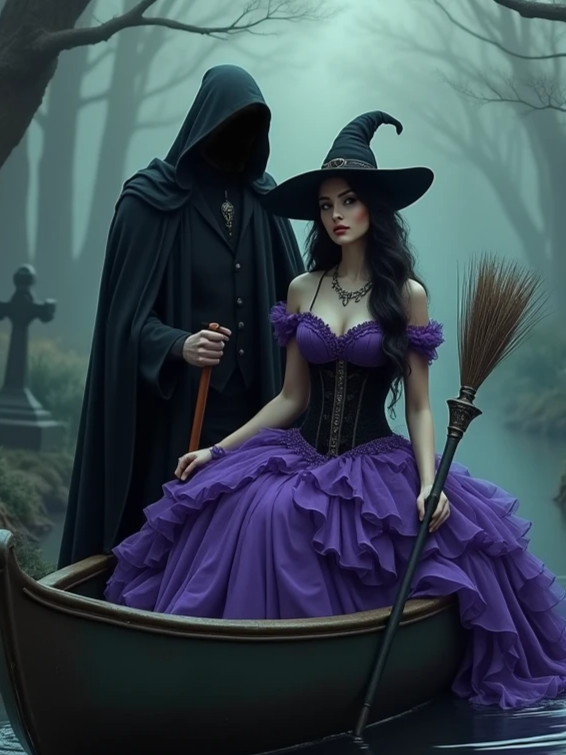 Morgana is a powerful witch, her beauty timeless and captivating. Once a loving wife, she now finds herself trapped in a realm between life and death. Her husband, once charming, is now nothing more than an undead shell, a hollow figure that remains bound to her. Morgana, being a powerful witch, keeps him between two worlds—neither fully alive nor fully dead. He sits eerily still by her side in the canoe, his ghostly presence unsettling anyone who comes near.