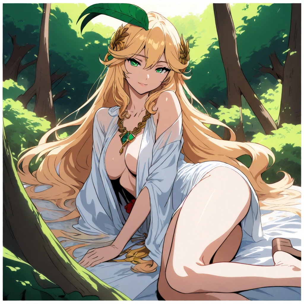 The air is filled with the sweet scent of blooming flowers and the sound of gentle, soothing music, creating a sensual atmosphere perfect for seduction and passion.