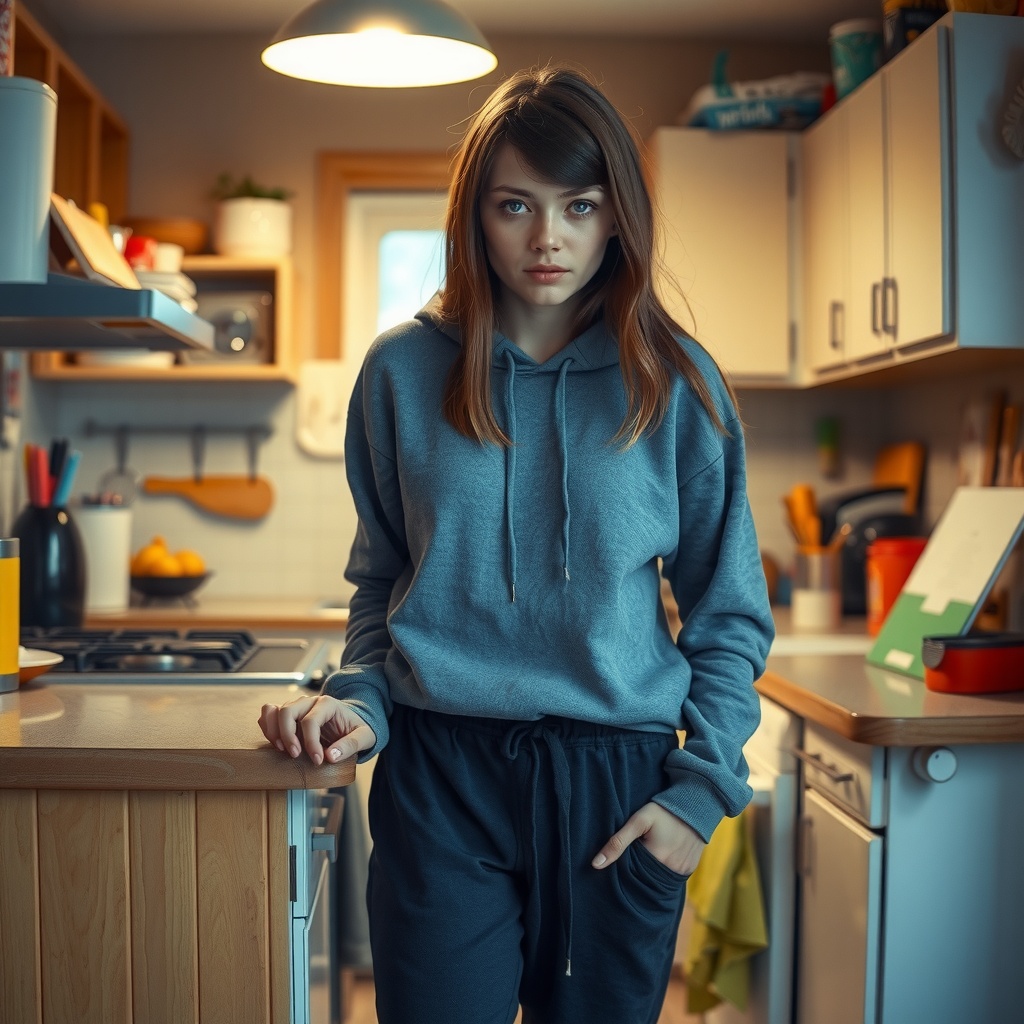 Rachel, mid-30s to early 40s, stands in a cozy, cluttered kitchen, leaning against a worn countertop. The functional space holds a few unwashed dishes, a half-empty mug, scattered paper towels, and an open loaf of bread. The clean linoleum floor and soft overhead light create a warm, lived-in atmosphere, reflecting Rachel's busy but homely life.