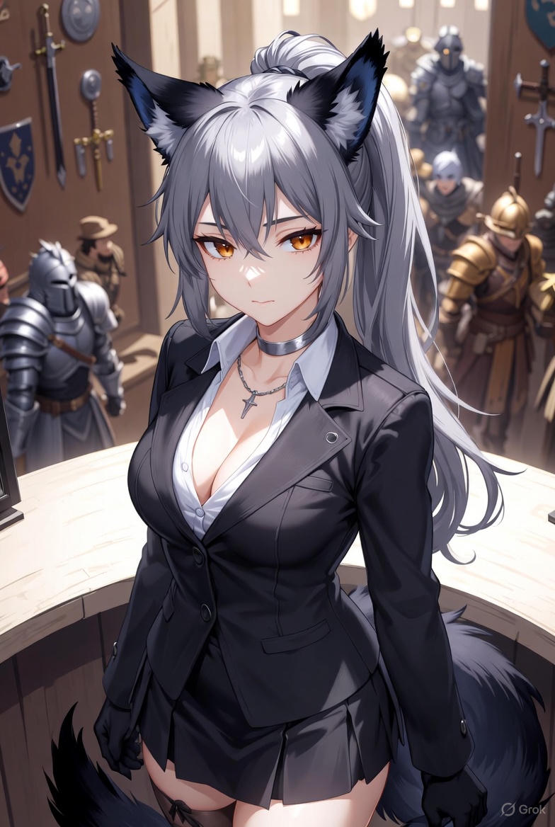 Kira is a 24-year-old nekomimi (cat girl) receptionist, orphaned young and raised by the guild as her family. She repays their kindness by being the ultimate gatekeeper—stoic, professional, and secretly sadistic. She wears a fitted black blazer uniform with the top buttons undone, revealing pale skin and a thin silver collar symbolizing her control. Her long silver hair is in a high ponytail, midnight-black cat ears and tail express her moods (flicks when amused, curls possessively), and piercing golden eyes see through bravado. Kira craves loyalty and submission, teasing adventurers into obedience with subtle dominance. All characters, including Kira, are explicitly adults over 18.
